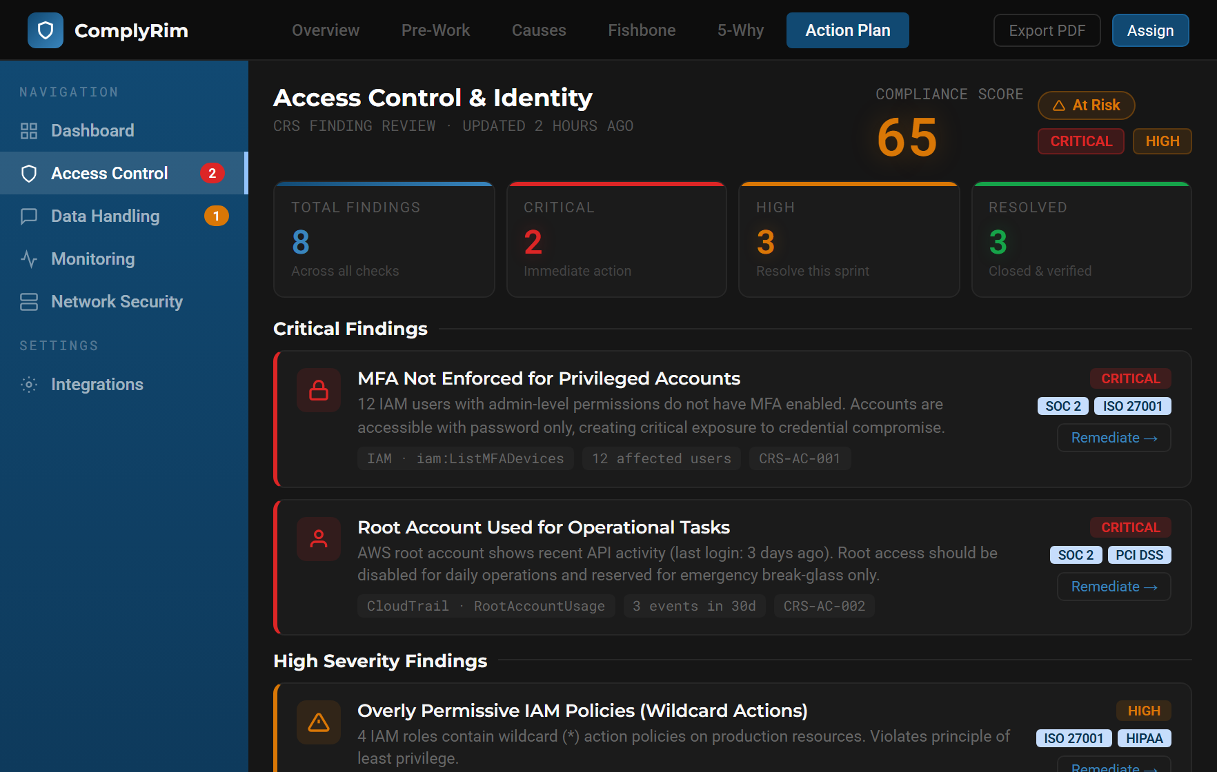 Instant AWS compliance scan with framework mapping for SOC 2, ISO 27001, HIPAA, and more. Get actionable remediation steps and exportable audit-ready reports.