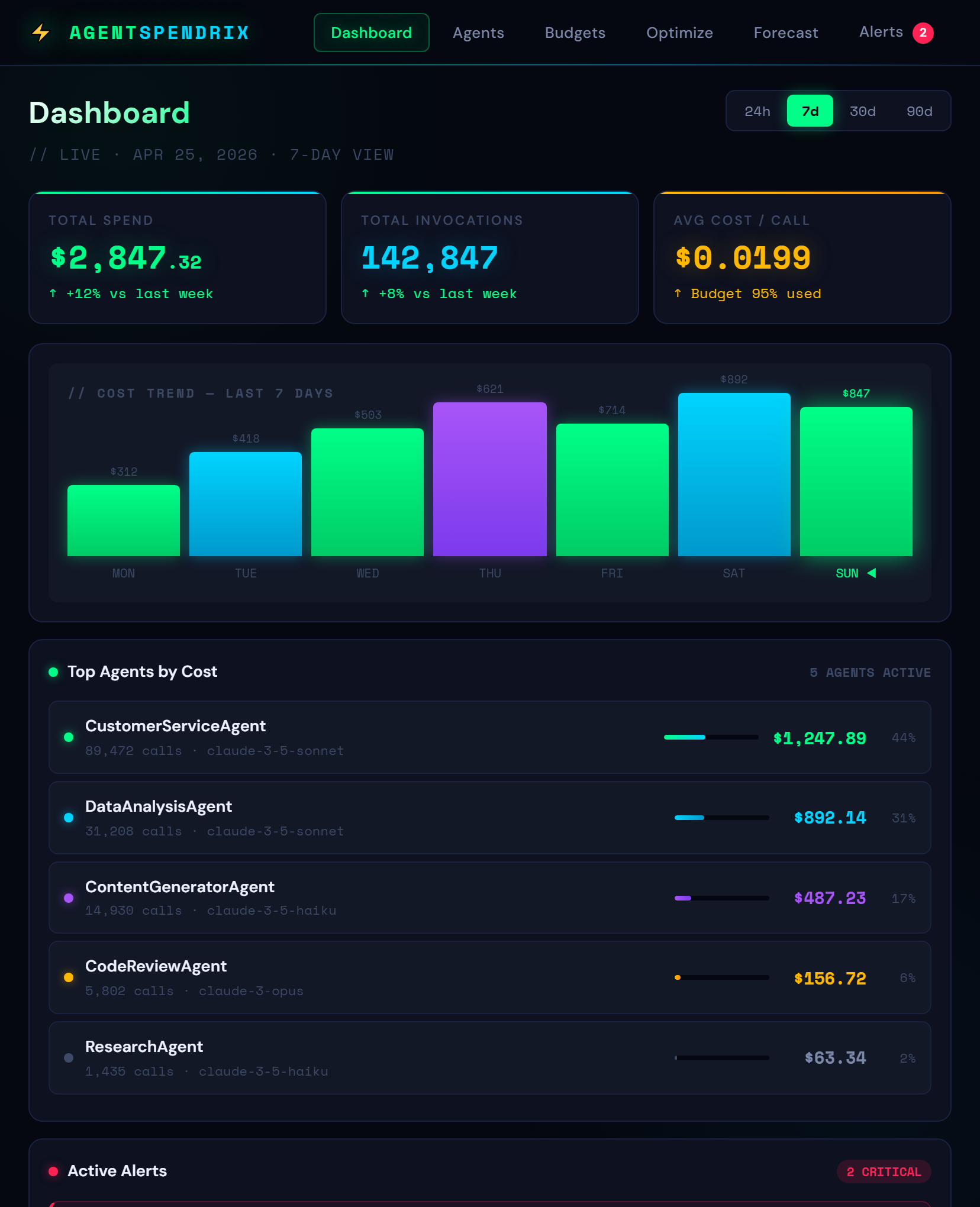 Track AI agent spend in real time with per-agent attribution. Set budgets, enforce limits, and save 30–50% with intelligent optimization.