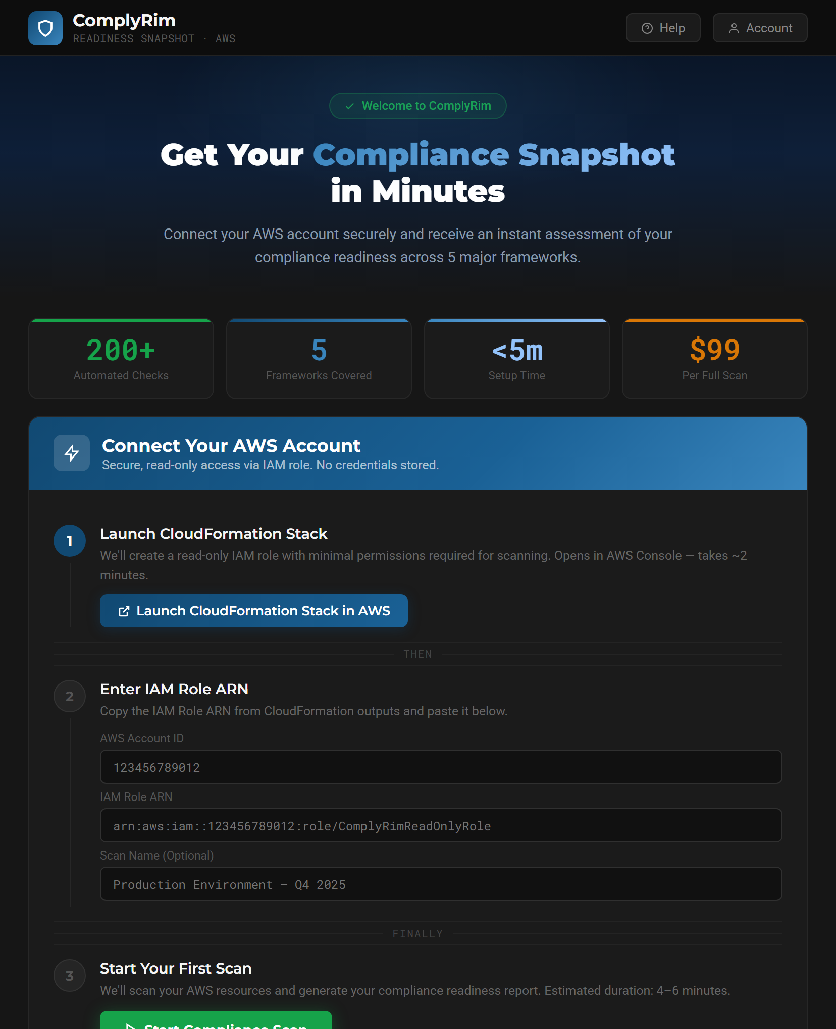 From a free readiness scan to a full audit package, ComplyRim walks your team through every step of the compliance journey.
