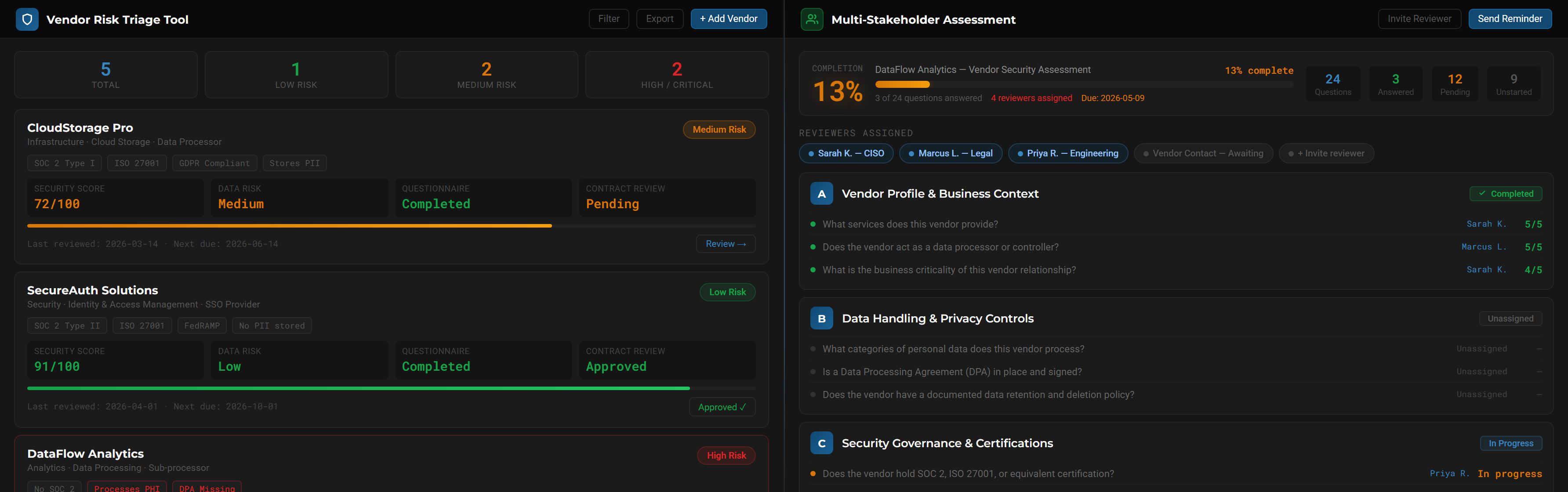 Track vendor risk across 8 domains with automated scoring, certification tracking, and instant audit-ready reports.